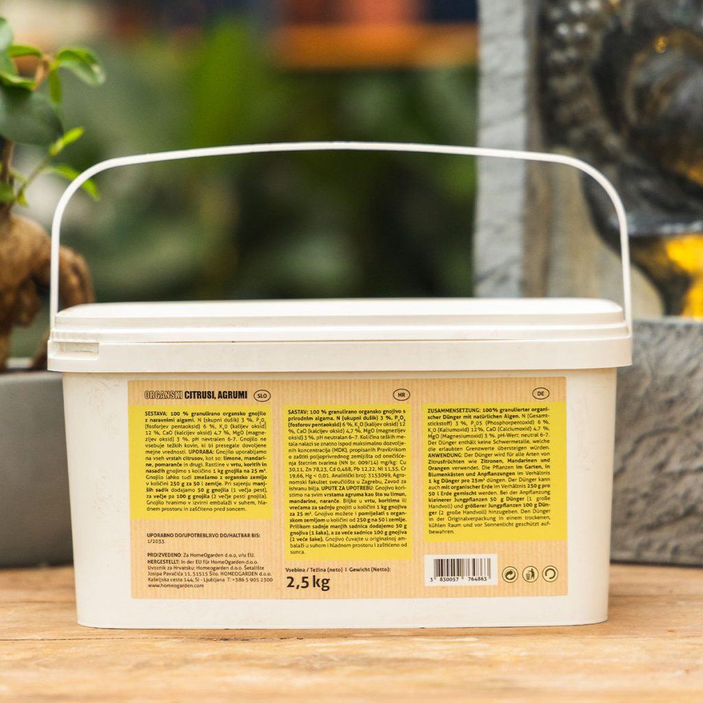 NPK s pojacanum kalijem i magnezijem. Poboljsava kiseli pH (5,5–6,5). Za agrume u posudama.