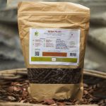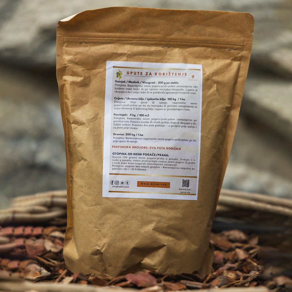 Komprimirani neem pogaca. Manje prasenja, sporije otpustanje. Dusik + azadirahtin. 1 kg za 10–15 m².