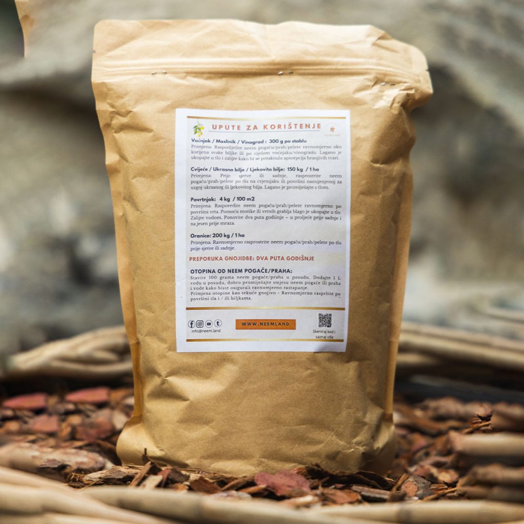 Dusik 5–6% + azadirahtin za odbijanje stetnika. Gnojivo + zastita u jednom. 1 kg za 10–15 m².