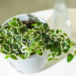 Ficus pumila Variegata, poznat kao Puzavi fikus, je mala biljka ogromnog šarma. Njegovi sitni, srcoliki listovi s bijelim i zelenim šarama stvaraju gust tepih zelenila koji prekriva teglu i elegantno se prelijeva preko ruba.