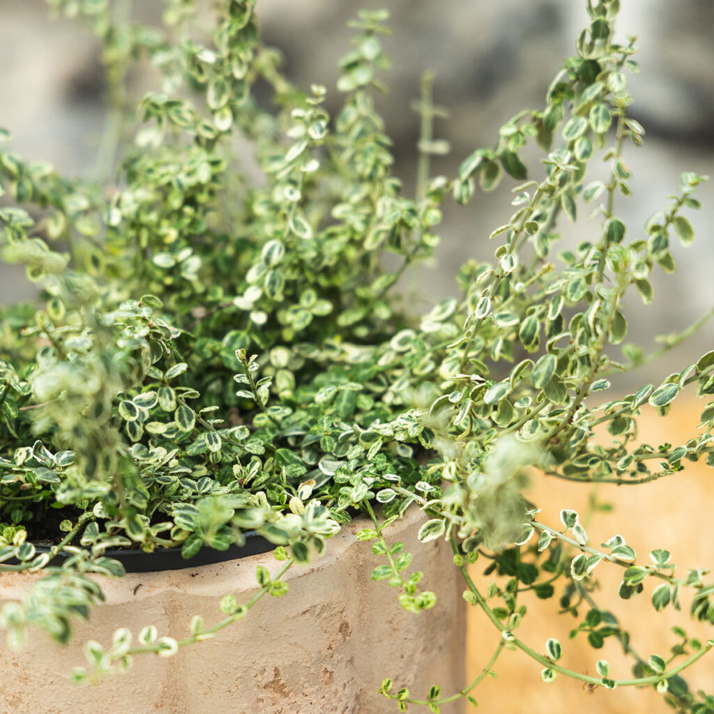 Biljka ima guste, razgranate izdanke s ovalnim listovima koji jasno pokazuju kremasto bijeli obrub. Kompaktna i dekorativna već pri isporuci.